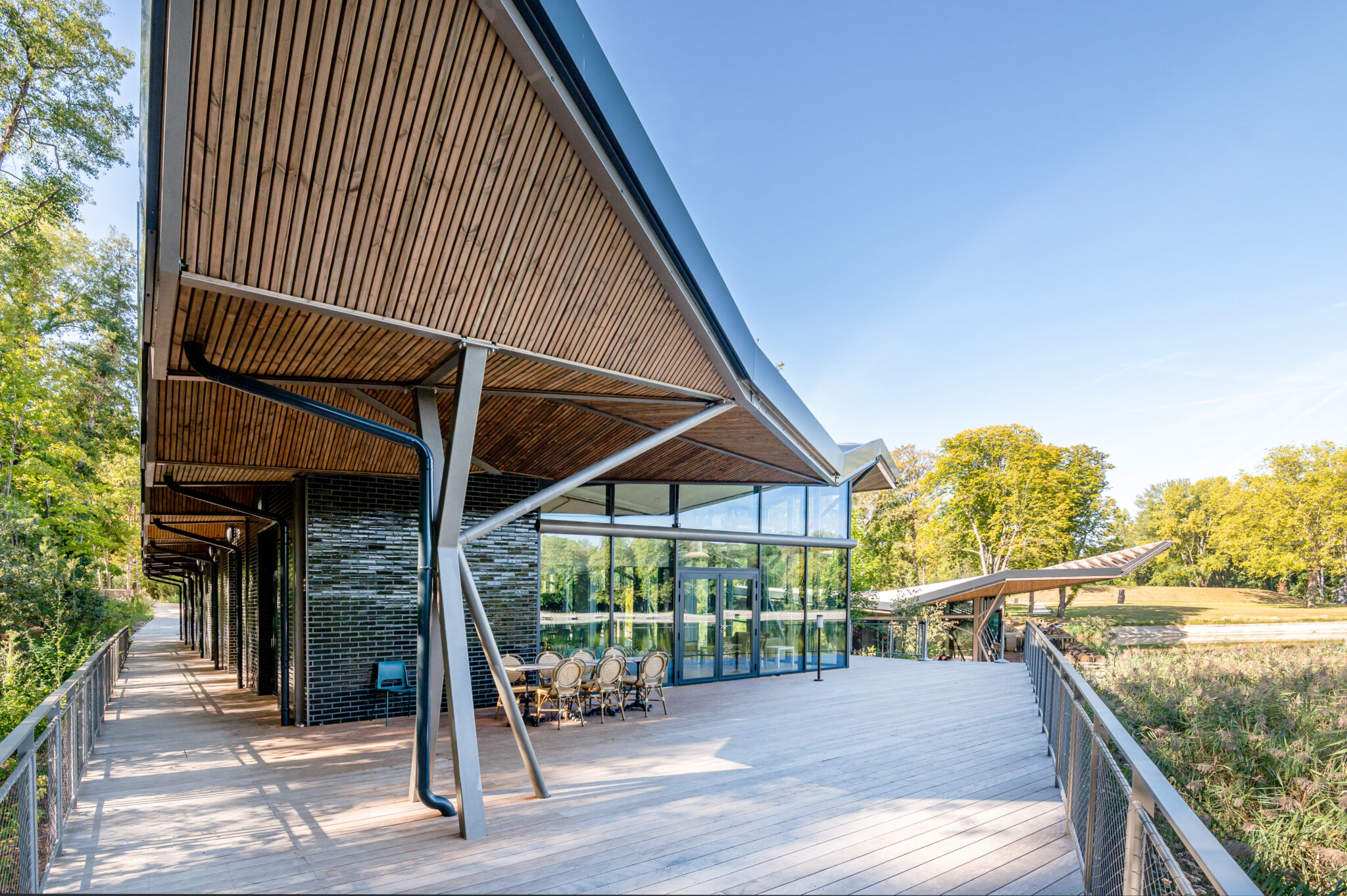 L’aménagement s’efforce de traduire la nature environnante dans toute sa mouvance, figure organique et vivante. L’espace s’ouvre sur le bassin à l’aide de baies vitrées. Conservant la charpente métallique apparente du bâtiment, des sous-pentes aux formes origamiques en lattes de bois se dessinent, répondant au bâtiment historique du Hangar Y conçu par Henri De Dion.